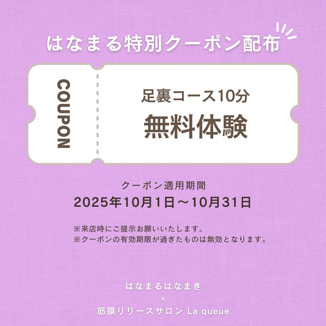 10月1日〜31日までの1ヶ月間、上記クーポンを来店時に店員さんへ見せて、足裏コース10分無料体験しちゃいましょう✨